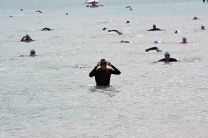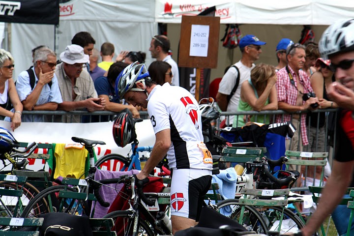 Aussi à l’aise dans l’eau qu’un bout de pain dans la fondue,  notre  représentant s’est  plutôt bien défendu mais n’a rien pu faire face à des spécialistes. Dès la sortie de l’eau, notre sportif s’est alors dépêché d’enlever sa combinaison néoprène pour enfiler une belle tenue de vélo ornée du blason envoiedugros et des numéros de nos 2 départements. En pleine possession de ses moyens (le décapadiot est un excellent cycliste), il a commencé a rattraper son retard dévorant ses adversaires les uns après les autres.